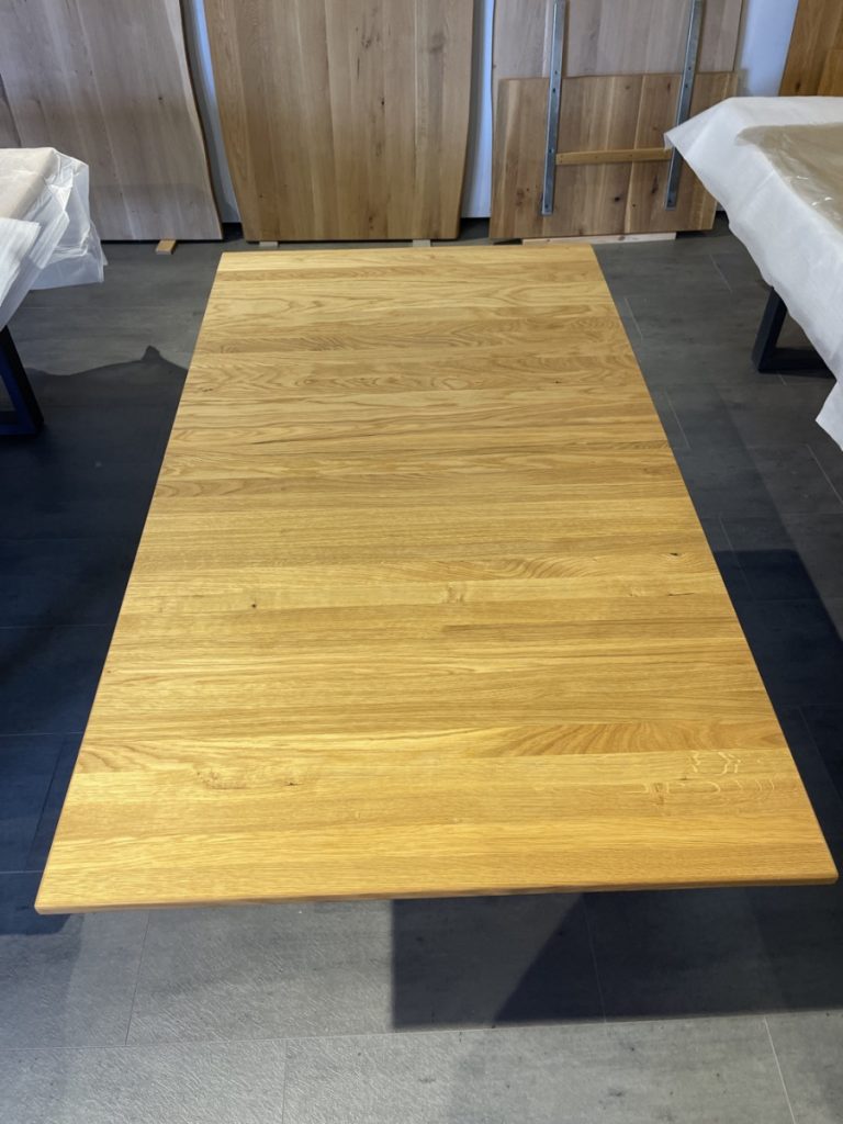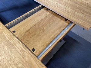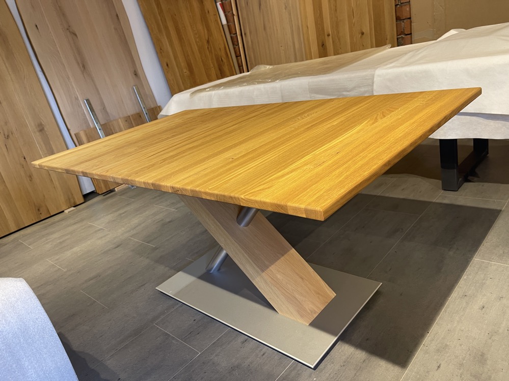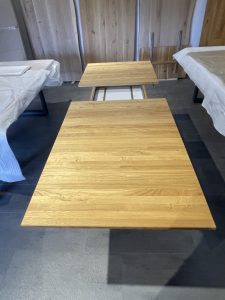 Esstisch in massiver Wildeiche Auszugstisch in massiver Eiche mit einer Einlegeplatte, 160/205 cm x 90 cm, Platte Öl-Wachs Natur, Fußplatte mit kleinem Transportschaden Abholpreis Ausstellungsstück € 390,—