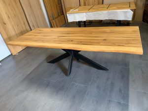 Tisch Wildeiche 240 cm x ca. 100 cm Baumkante, Fuß Doppel-X schwarz matt (Nr. 18)